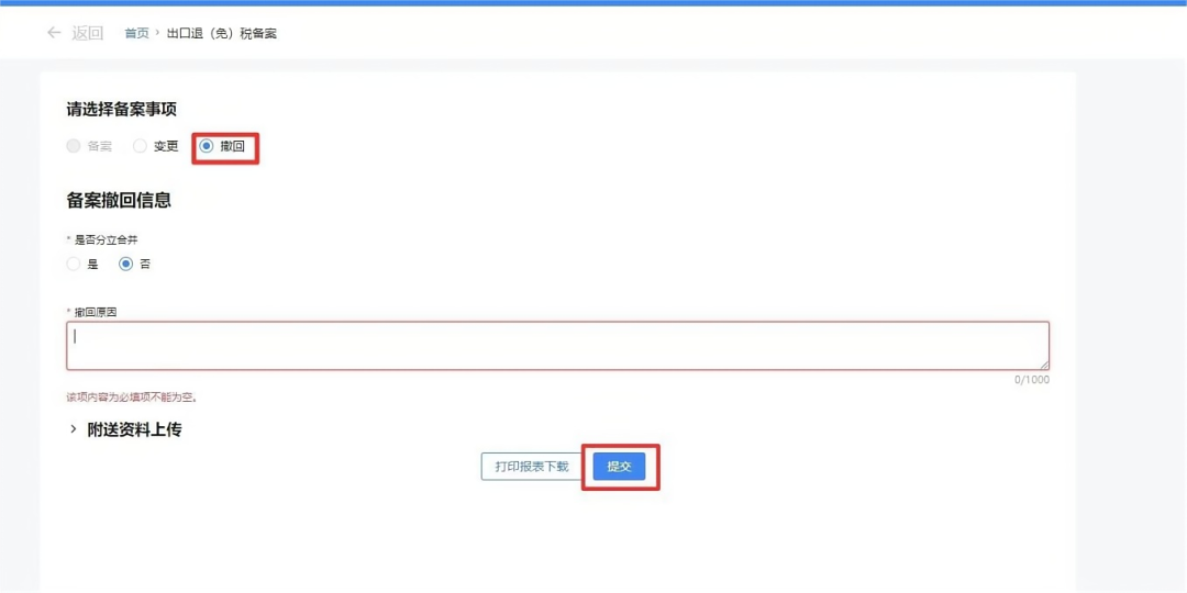 点击【我要办税】-【出口退税管理】-【出口退(免)税企业资格信息报告】-【出口退(免)税备案】功能菜单,选择“撤回”,根据实际情况选择“是否分立合并”,同时输入“撤回原因”,确认无误后,点击“提交”,显示申请成功界面即可。