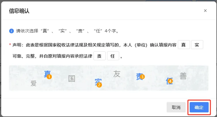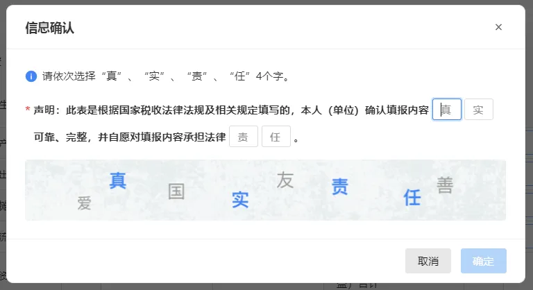 填报完成后,点击【提交申报】,按提示补全声明信息后点击【确定】,即可完成申报。