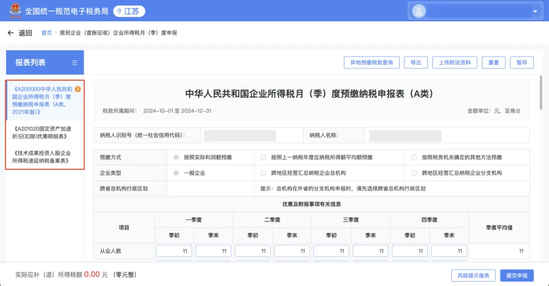 若存在免税收入、减计收入、加计扣除、所得减免或减免所得税额情形,可点击主表第7、8、13栏的【填写优惠事项】,进行勾选和填写。