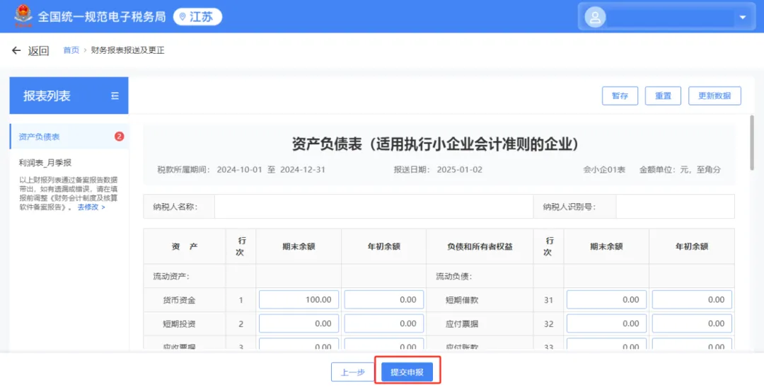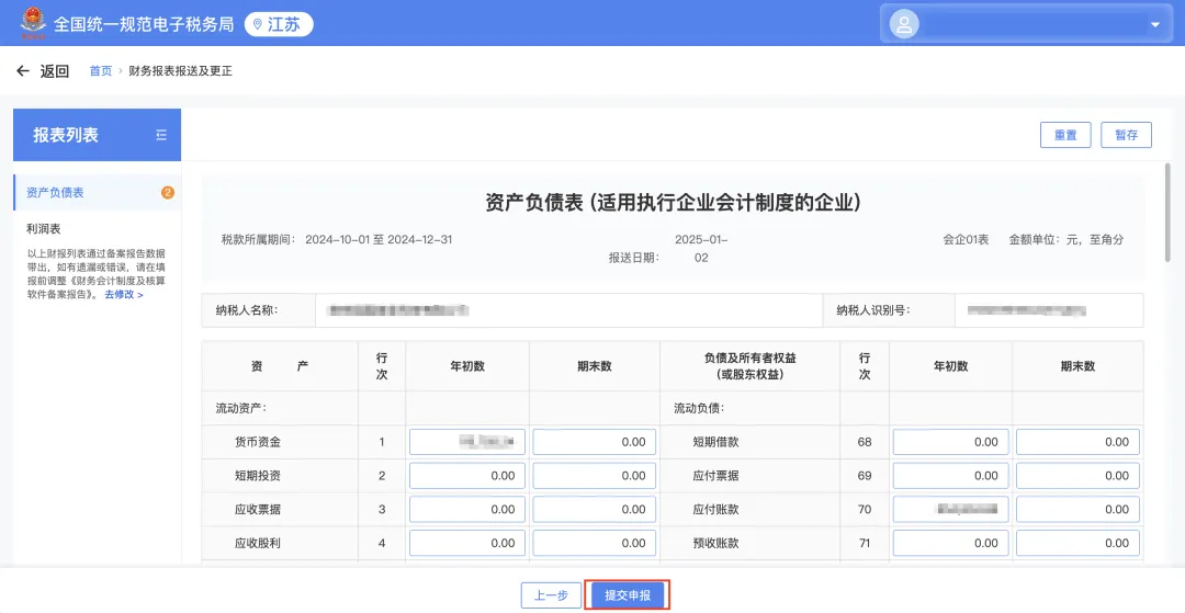①点击【在线填写】-【下一步】,进入报表在线填写界面,左侧列表可切换填报其他表单。填写完成后,点击【提交申报】。