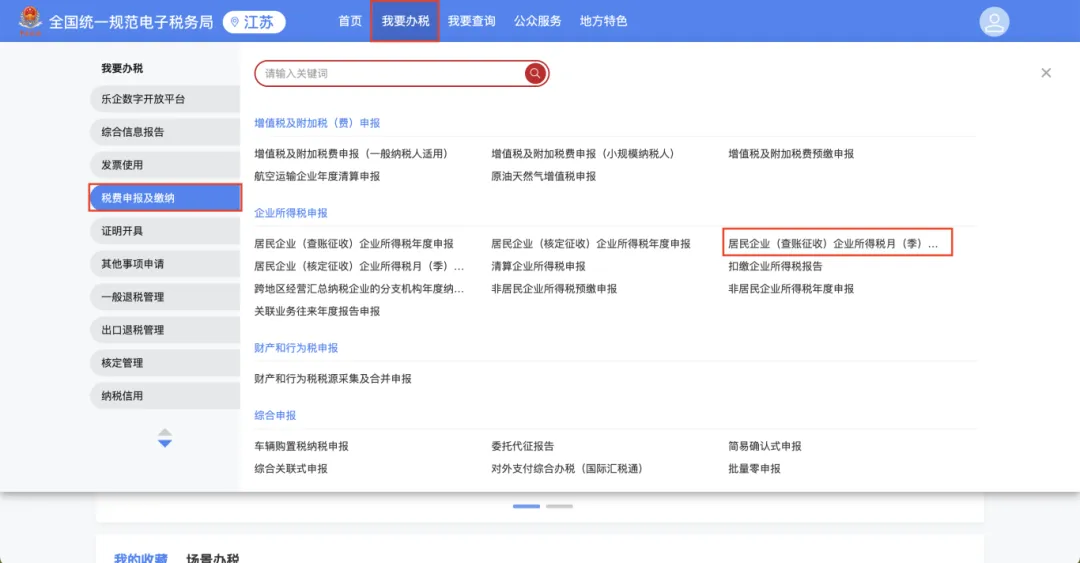 点击【我要办税】-【税费申报及缴纳】-【居民企业(查账征收)企业所得税月(季)度申报】。