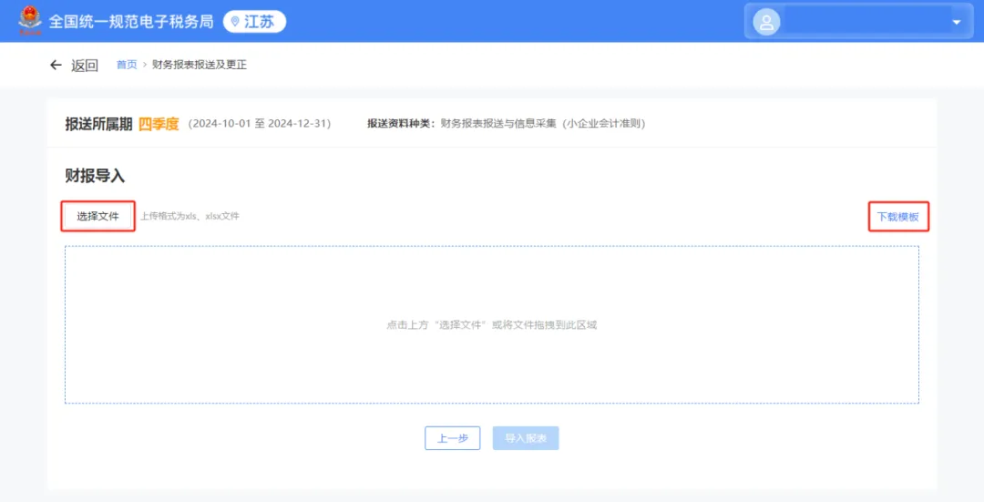 ②点击【选择文件】上传已填写的模板,点击【导入报表】-【提交申报】。