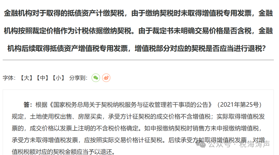问:金融机构对于取得的抵债资产计缴契税,由于缴纳契税时未取得增值税专用发票,金融机构按照裁定价格作为计税依据缴纳契税。由于裁定书未明确交易价格是否含税,金融机构后续取得抵债资产增值税专用发票,增值税部分对应的契税是否应当进行退税?