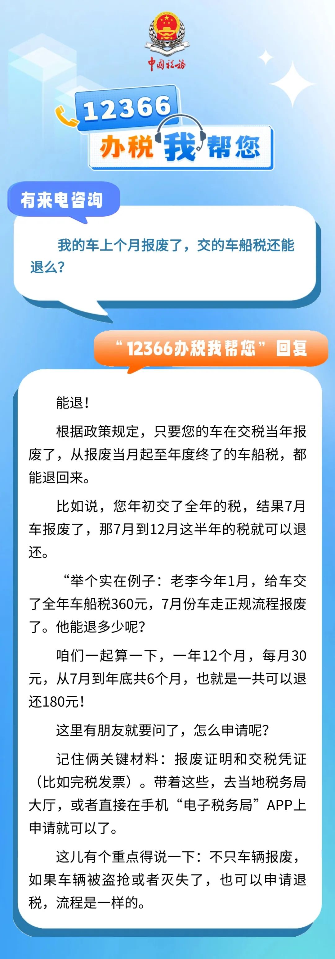 有来电咨询 :我的车上个月报废了,交的车船税还能退么?一起来看看回复吧↓