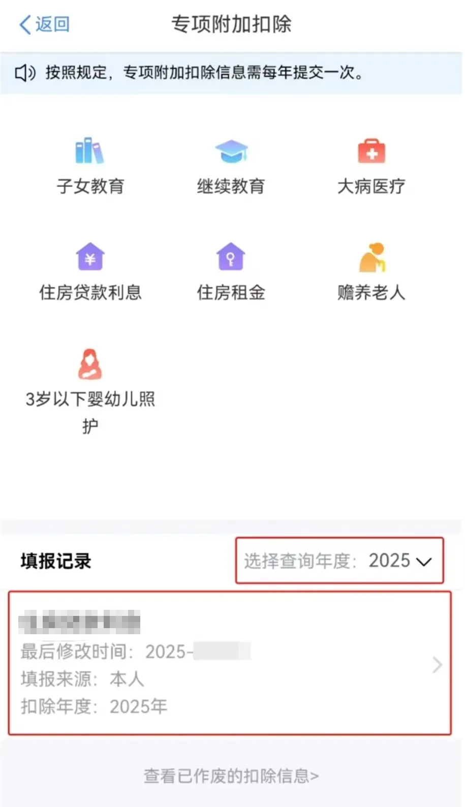 第二步:在首页“重点服务推荐”模块,点击【我要查询】,进入专项附加扣除界面后,选择查询年度【2025】,点击填报记录中的专项附加扣除项目。