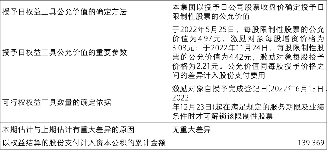 本集团以授予日公司股票收盘价确定授予日限制性股票的公允价值。首次授予日和预留授予日公司股票收盘价分别为40.34元和57.17元,考虑激励计划对可行权日后的限制条件影响后与激励对象每股增资价格19.57元和28.36元的差额并计入股份支付费用。