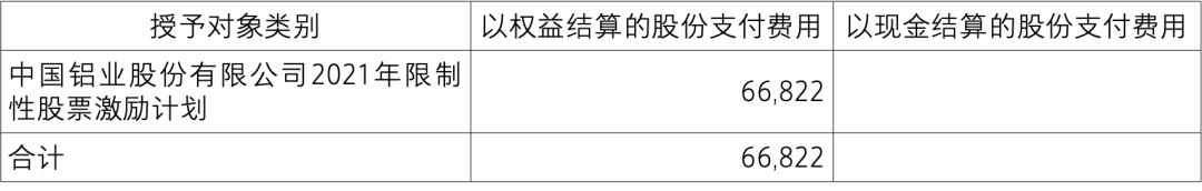 根据2022年4月26日召开的股东大会决议通过的《中国铝业股份有限公司2021年限制性股票激励计划》(“激励计划”),本集团向任职的公司董事、高级管理人员、中层管理人员、核心技术(业务)骨干(“激励对象”)实施限制性股票激励计划,于2022年5月25日,授予930名激励对象112,270千股限制性股票(A股),授予价格为每股3.08元;于2022年11月24日,授予276名激励对象26,649千股限制性股票(A股),授予价格为每股2.21元。上述授予的限制性股票不超过股本的1%。激励对象自授予完成登记日(2022年6月13日、2022年12月23日)起在满足规定的服务期限及业绩条件时才可解锁该限制性股票。根据激励计划方案,激励对象在服务期满前离职或业绩条件未达成时,股票不得解锁,且本集团须按授予价格回购并注销相应限制性股票。授予限制性股票的业绩条件指标包括公司的净资产回报率、归母扣非净利润增长率及经济增加值。截至2022年12月31日,本集团已收到全部1,206名激励对象缴纳的出资额合计404,685千元,同时确认限制性股票回购义务404,685千元(附注七、42)。