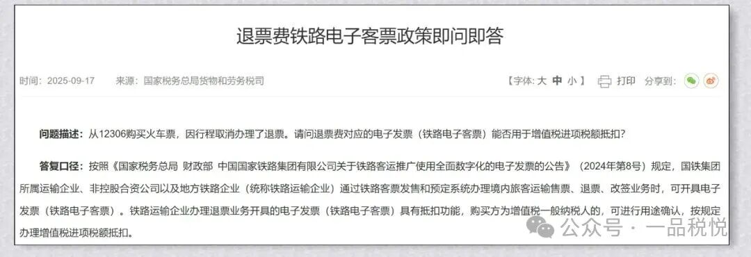 总局最新的这个解答好:退票费铁路电子客票能抵扣进项