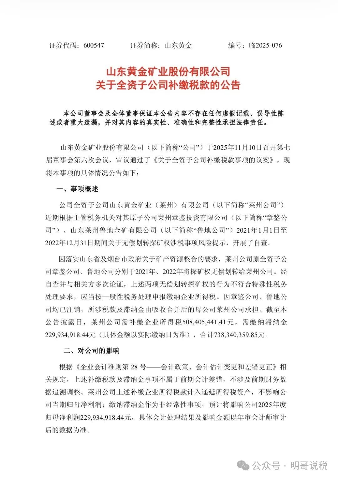 上市公司涉税公告ll山东黄金矿业股份有限公司关于全资子公司补缴税款的公告:补税5.08亿元+滞纳金2.3亿元,合计7.38亿元