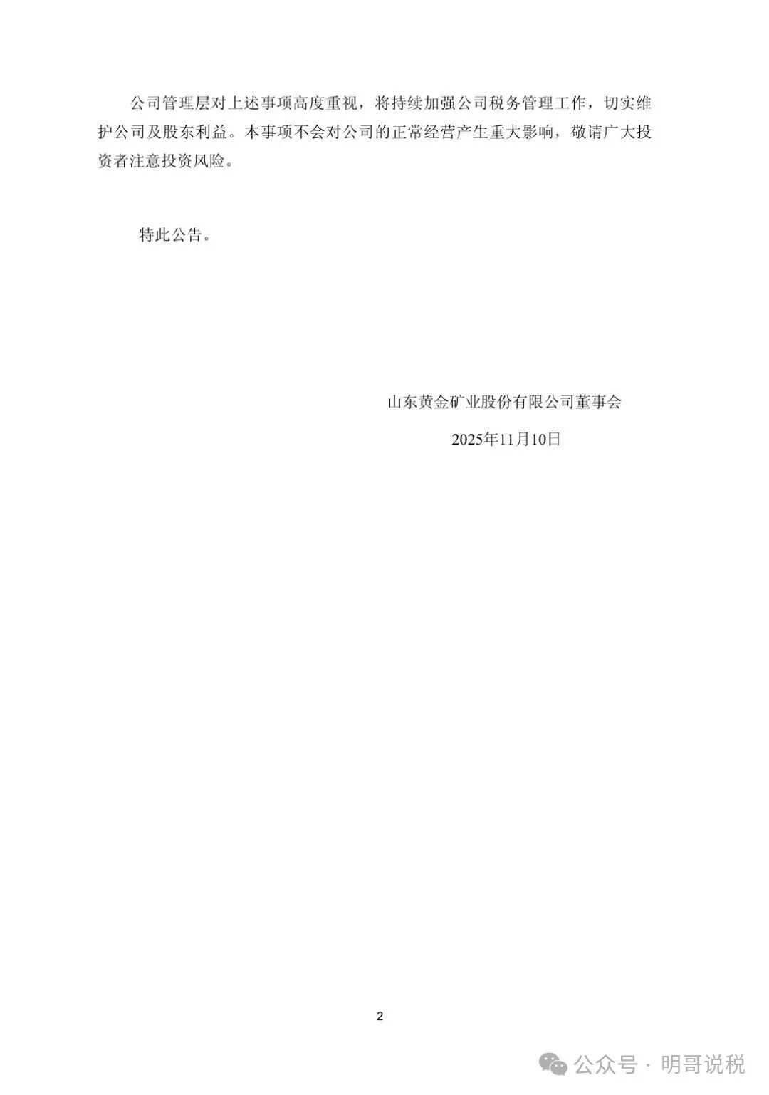 山东黄金矿业股份有限公司(以下简称“公司”)于2025年11月10日召开第七 届董事会第六次会议,审议通过了《关于全资子公司补缴税款事项的议案》,现 将本事项的具体情况公告如下: