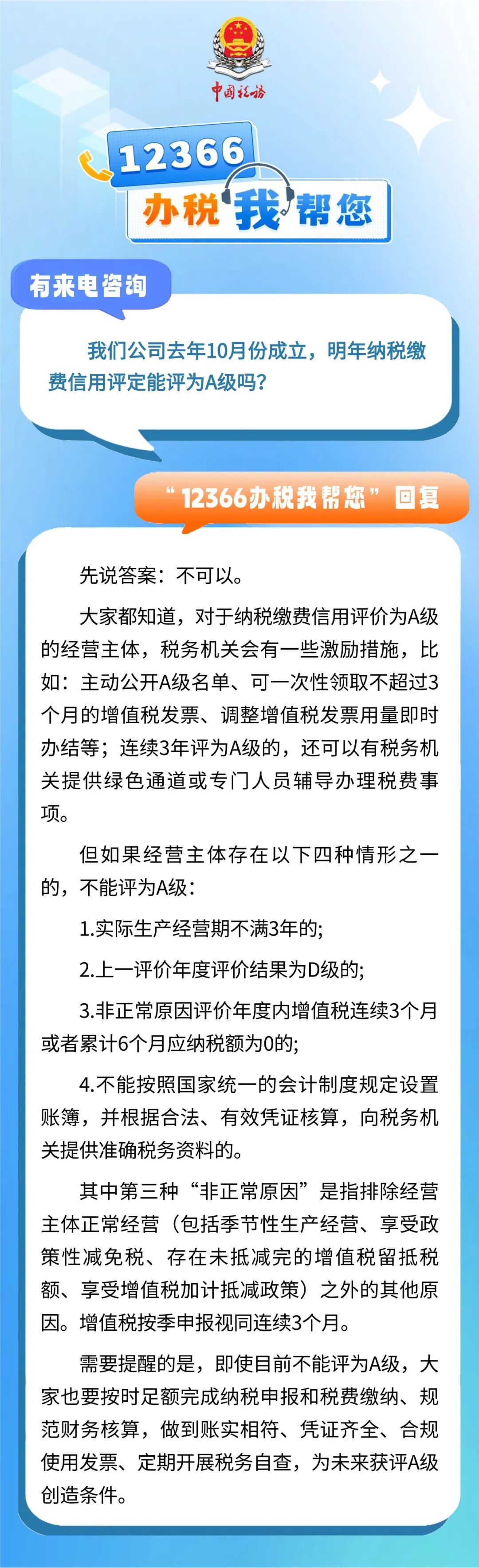 有来电咨询 :我们公司去年10月份成立,明年纳税缴费信用评定能评为A级吗?一起来看看回复吧↓