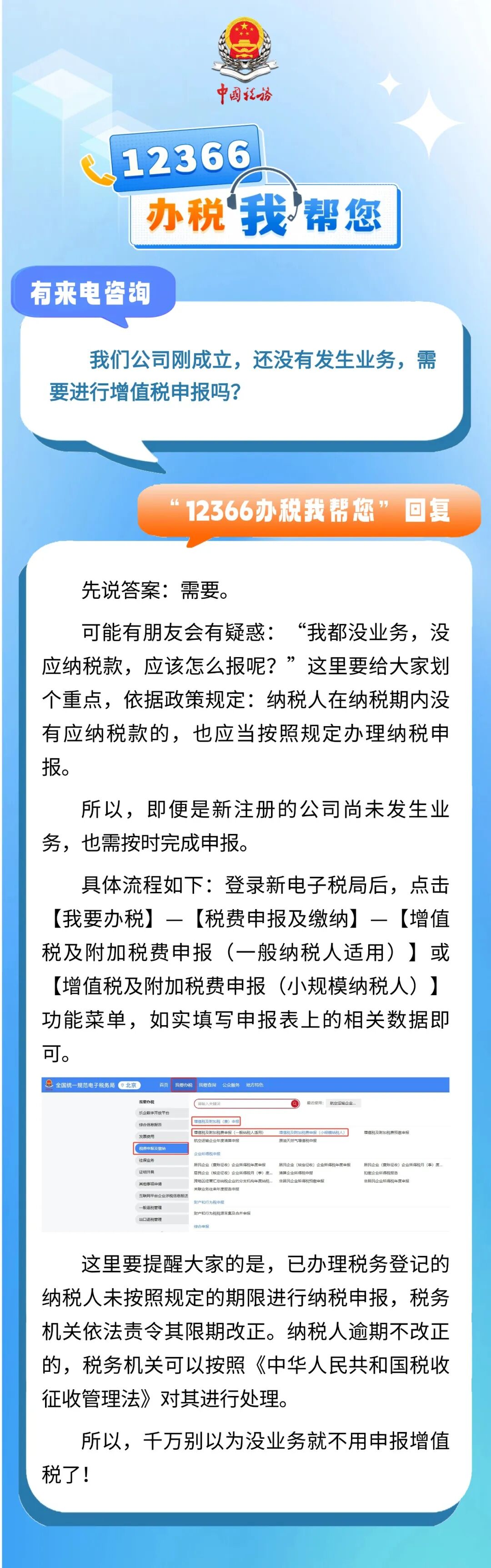 有来电咨询 :我们公司刚成立,还没有发生业务,需要进行增值税申报吗?一起来看看回复吧↓