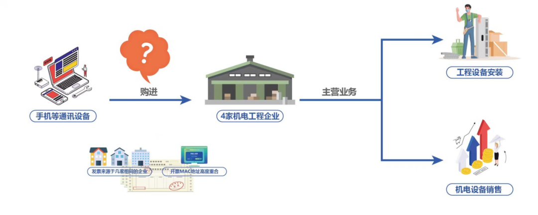 前期,大连市税务局第一稽查局通过税收大数据分析发现,4户主营业务为工程设备安装、机电设备销售等的本地企业,却从外地购入了大量与自身生产经营活动无关的手机等通讯设备,共取得了金额逾2800万元的增值税专用发票和增值税普通发票,且发票均来源于相同的几家企业,开票地址高度重合。