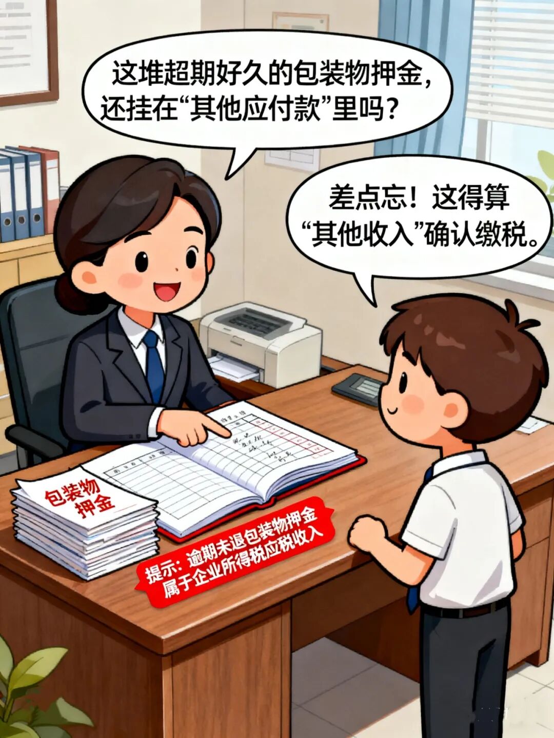 企业在生产经营过程中取得的逾期包装物押金,未按照税法规定要及时确认收入,影响应纳税所得额,进而少缴税款,产生补缴税款以及罚款的风险。