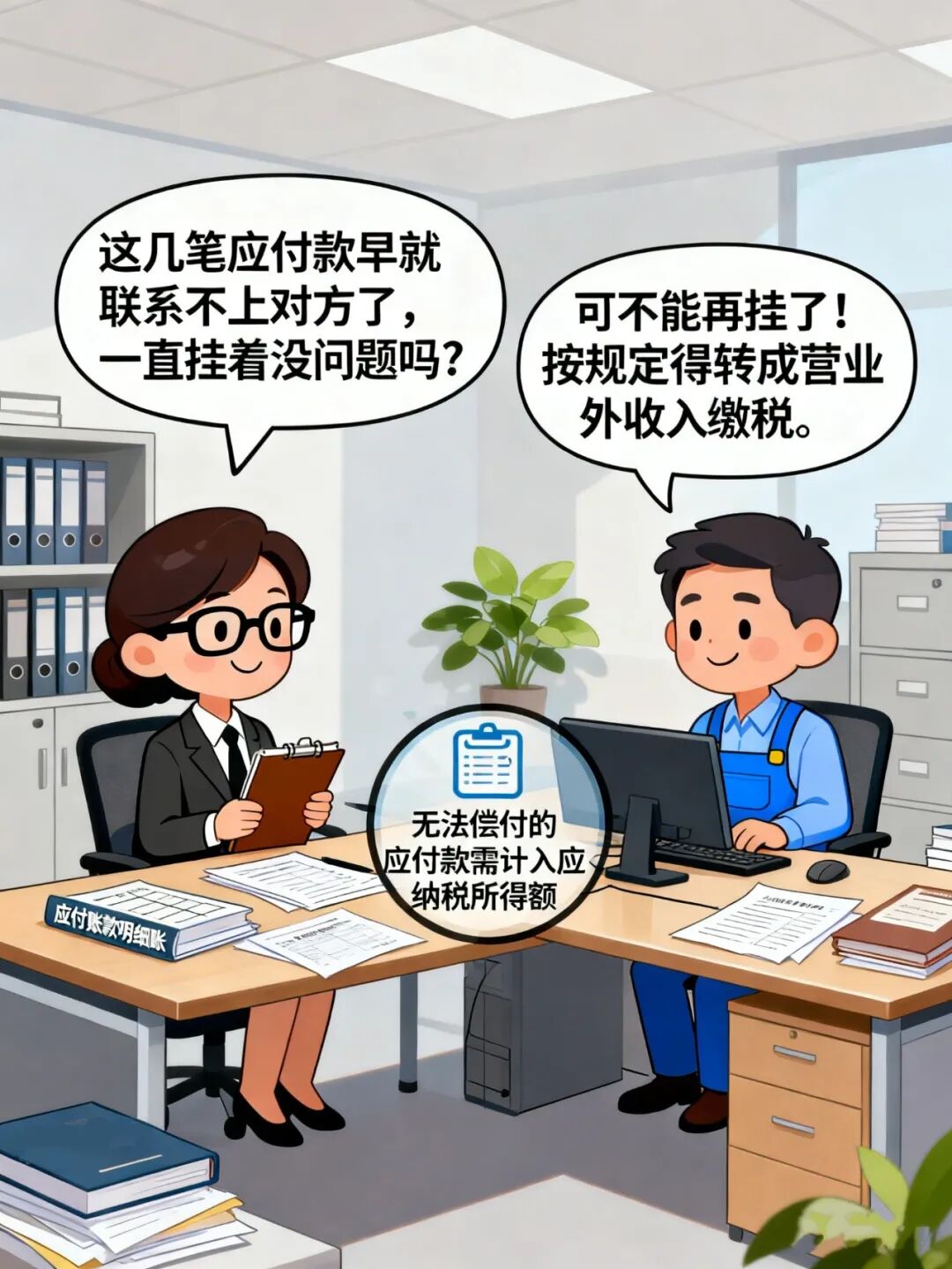 企业存在确实无法偿付的应付款项长期挂账不处理,除另有规定外,应该按税法规定均应一次性计入确认收入的年度计算缴纳企业所得税,否则存在少缴所得税的风险。