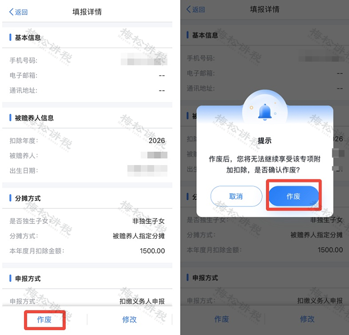 (2)点击进入想要作废的专项附加扣除项目。点击左下角【作废】,确认作废后,即可作废成功。
