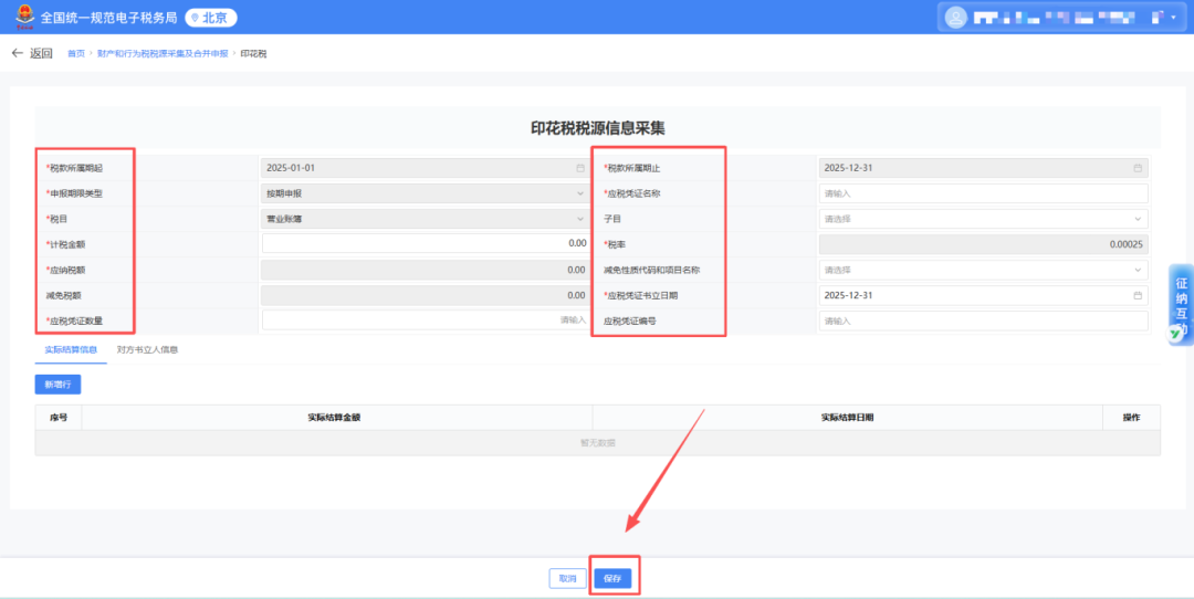 印花税税源采集成功后税源信息自动带入印花税税源明细表,核对信息无误后可点击【提交】。