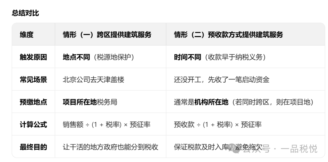 在实际业务中,情形(一)和情形(二)经常是叠加的。例如:北京的公司去天津盖楼,并且在开工前收到了天津甲方的预付款。此时,该公司既要满足 “跨区” 的要求,又要满足 “预收款” 的要求,通常需要在天津(项目地)就这笔预收款进行预缴。