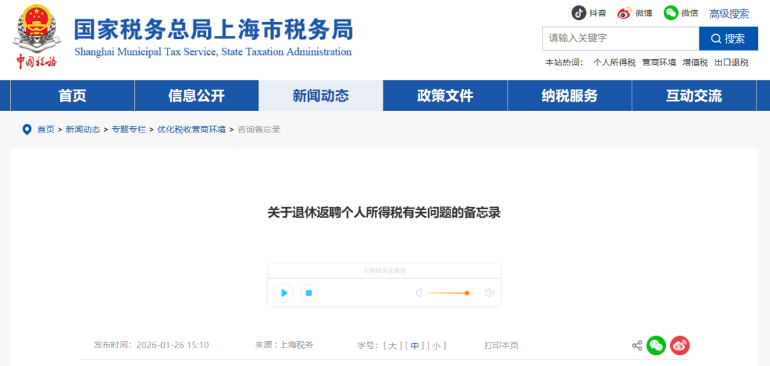 编者按:2026年1月26日,上海市税务局官网发布《关于退休返聘个人所得税有关问题的备忘录》,对广大离退休人员取得的收入缴纳个人所得税问题具有指导意义。现予全文转发,以飨诸友。