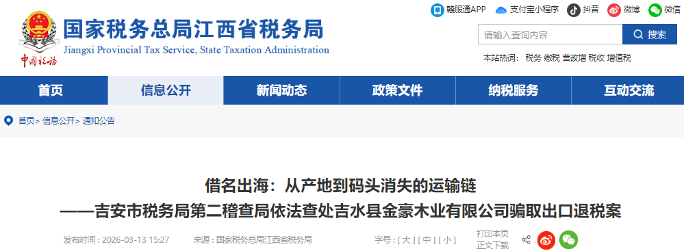 近期,国家税务总局吉安市税务局第二稽查局依法查处吉水县金豪木业有限公司(以下简称“金豪木业公司”)骗取出口退税案件。经查,2020年至2024年,金豪木业公司通过签订虚假买卖合同、购买他人出口货物报关单信息等违法手段骗取出口退税。针对其违法行为,2025年7月,税务部门依据《中华人民共和国税收征收管理法》等相关法律法规规定,对吉水县金豪木业有限公司追缴骗取出口退税款并处罚款共计307.11万元,一年九个月内停止为其办理出口退税。目前,案件已移送公安机关。