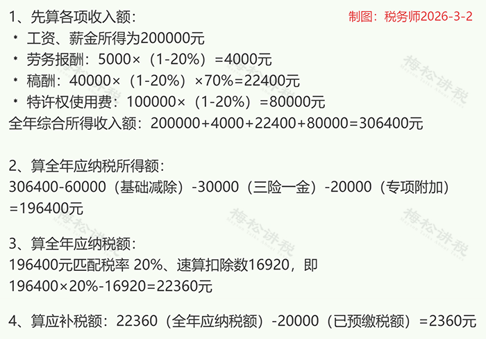案例:小松2025年全年工资20万,三险一金扣3万,专项附加扣除2万;劳务报酬5000元,稿酬4万,特许权使用费10万,已预缴个税2万,汇算时该补多少?