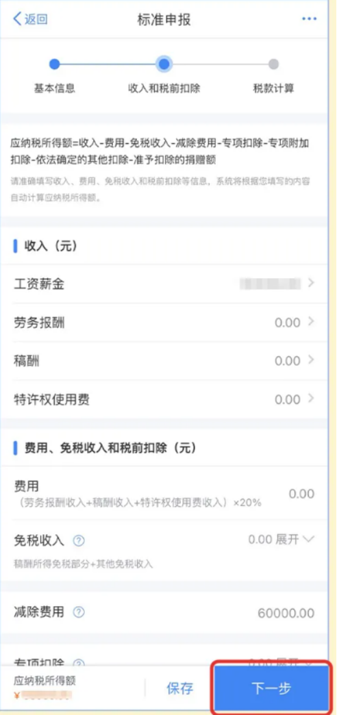 2、进入收入和税前扣除界面→重点点击【工资薪金】板块,确认年终奖计税方式(单独计税/合并计税),两种方式都试一遍,选择最优的,其他收入和扣除项核对无误后点【下一步】。