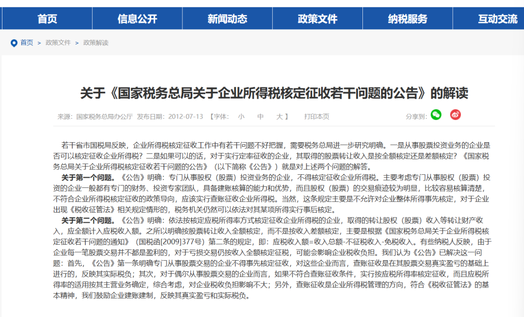 2012年6月19日,税务总局发布《关于企业所得税核定征收有关问题的公告》(国家税务总局公告2012年第27号)。这一公告的内容主要是规定对于专门从事股权股票投资业务的企业不得核定征收企业所得税。税务总局对这份公告的官方解读中解释了制定这一公告的背景和原因。