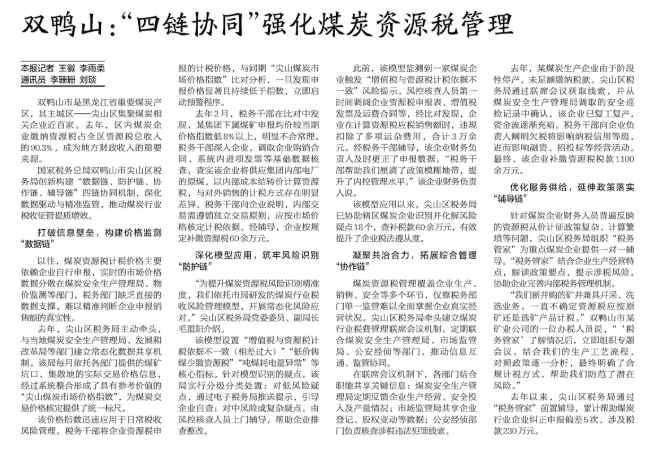 国家税务总局双鸭山市尖山区税务局创新构建“数据链、防护链、协作链、辅导链”四链协同机制,深化数据驱动与精准监管,推动煤炭行业税收征管提质增效。