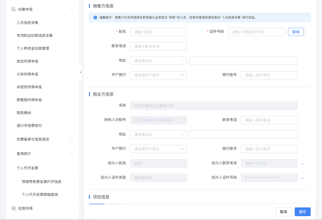 销售方信息:选择本次的代开申请人,若未查询到请先前往“人员信息采集”功能进行添加。