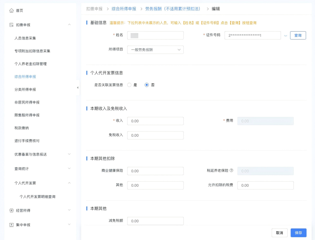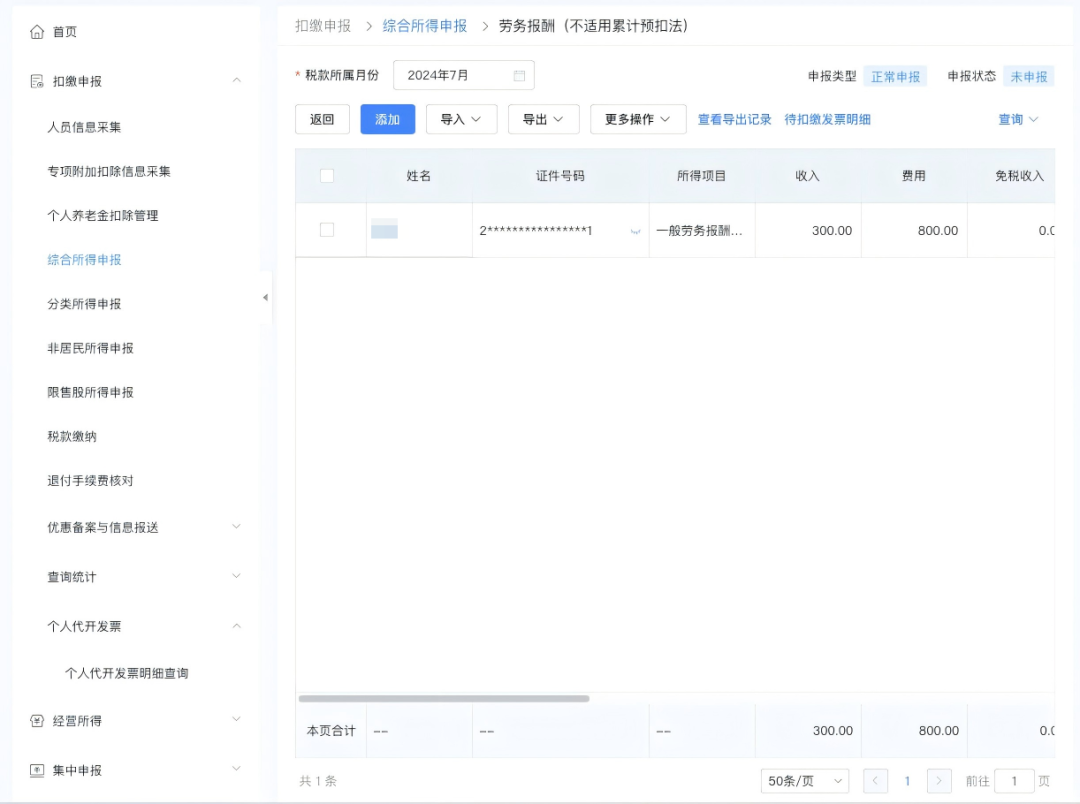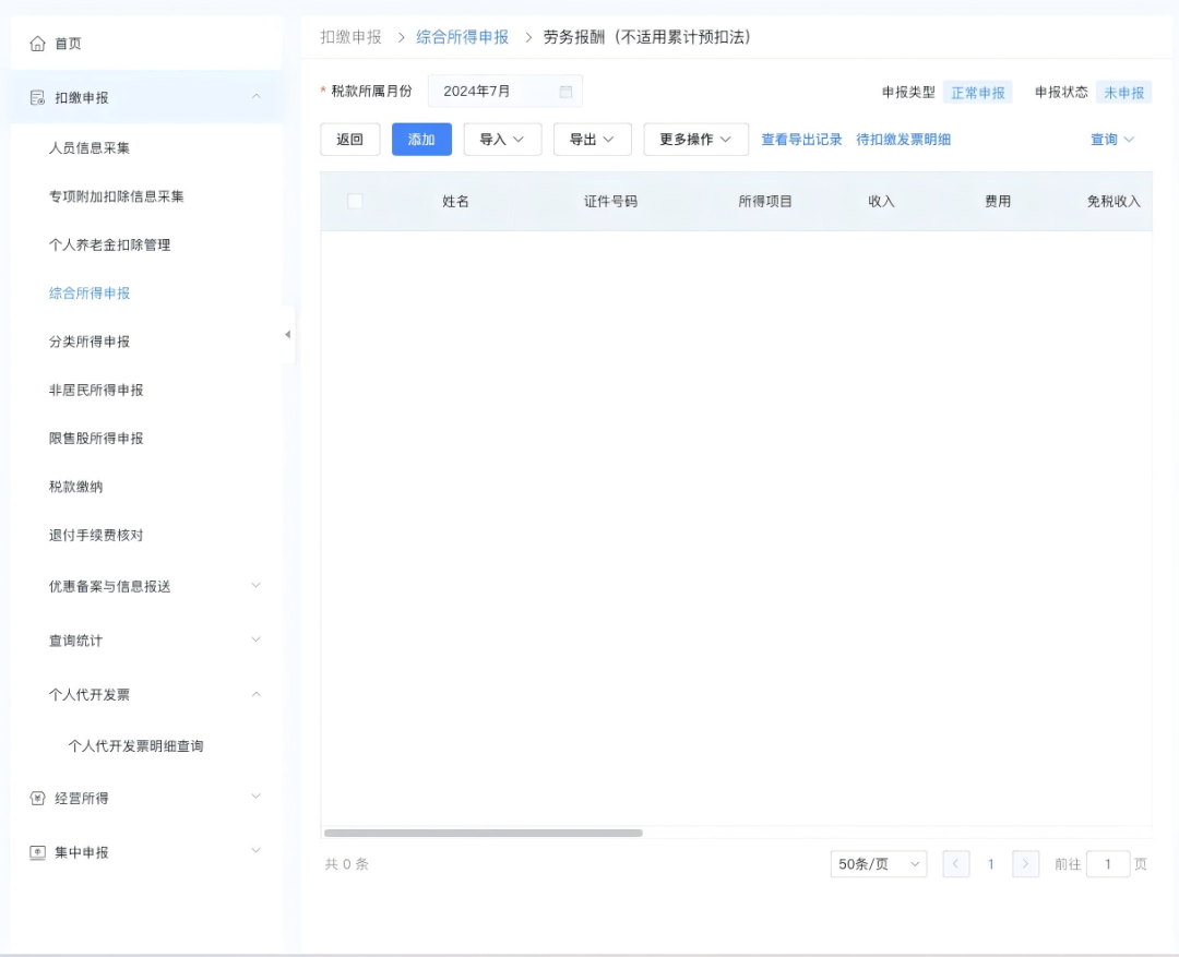 也可以在录入扣缴申报收入信息时手动关联发票。点击“添加”按钮进入扣缴申报填写页面,选择需扣缴申报的自然人。