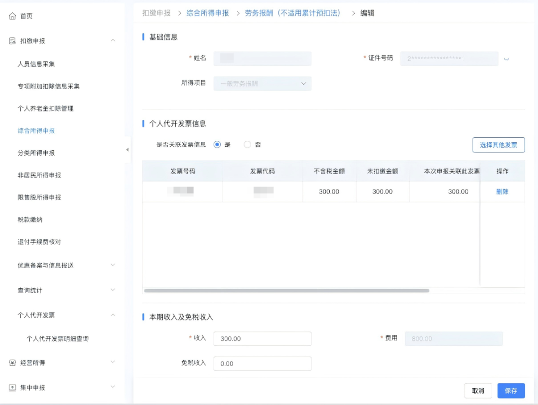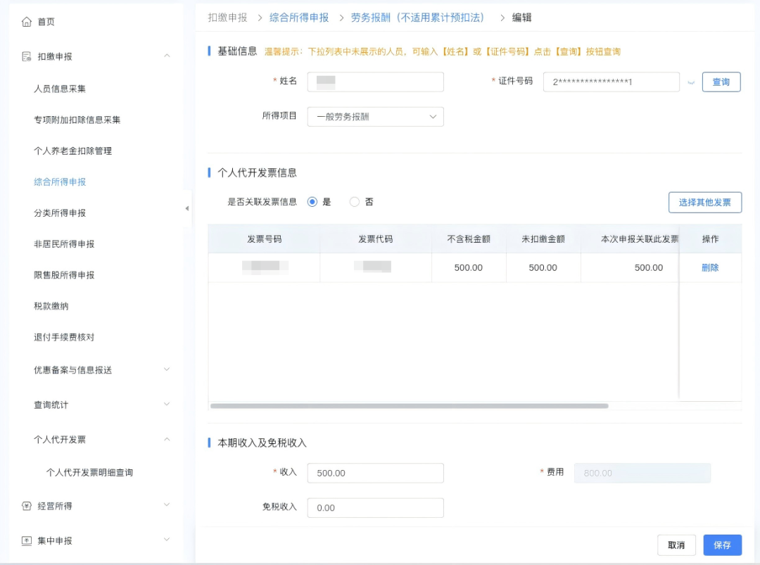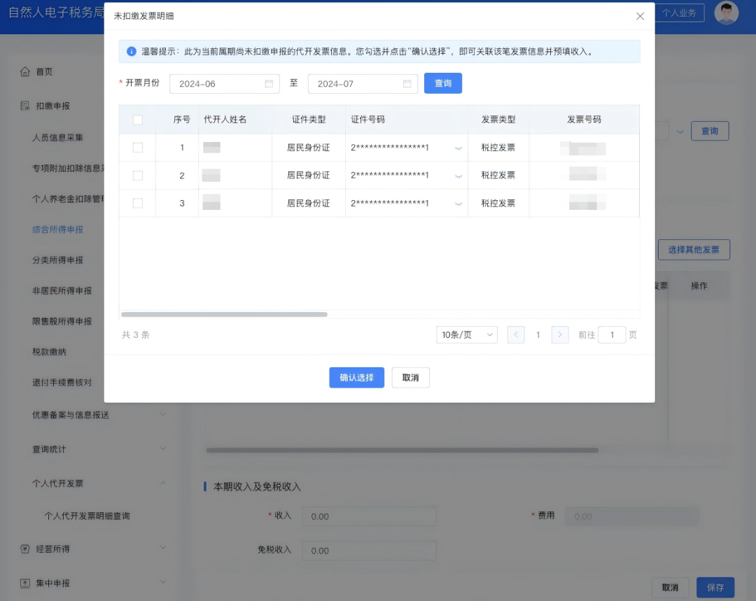 场景A:通过“个人代开发票明细查询”扣缴申报关联发票