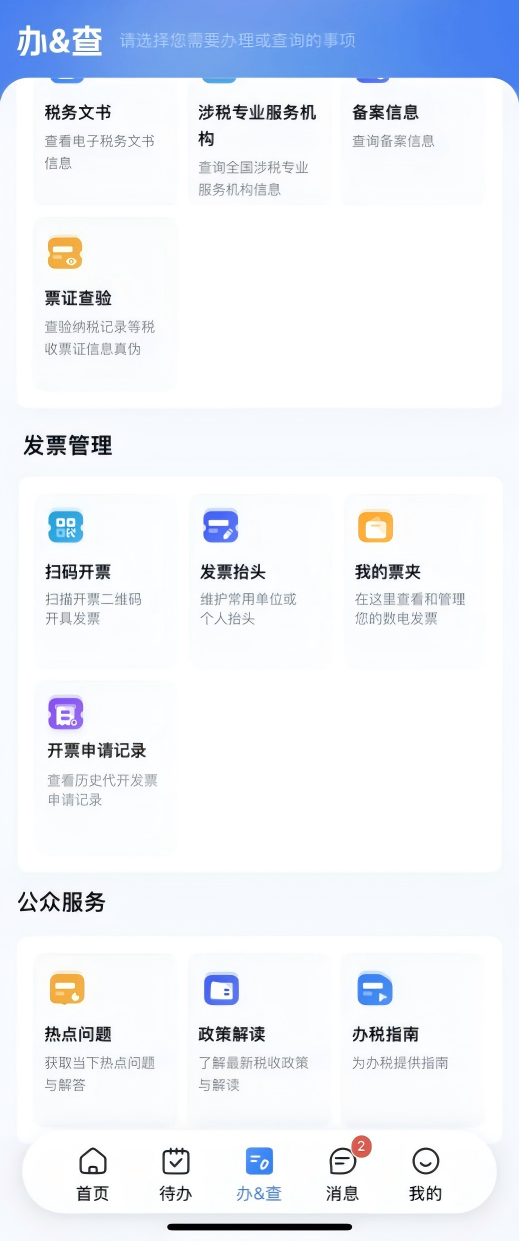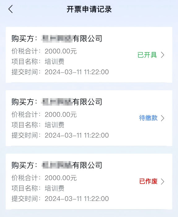 进入“办&查”频道,点击“发票管理→开票申请记录”可查看到历史待申请、待缴款、已开具、已作废等代开申请记录。点击记录信息”,将进入记录详情页面,可查看具体记录信息,包括缴款信息、购买方信息、项目信息和备注信息四部分。