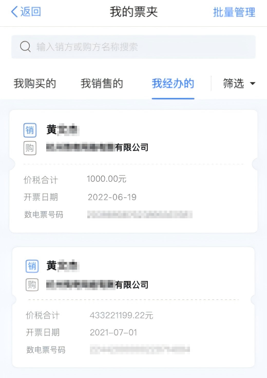 销售方完成发票开具后,在“办&查”频道,点击“发票管理→我的票夹→我销售的”可查看到已开具的代开发票。
