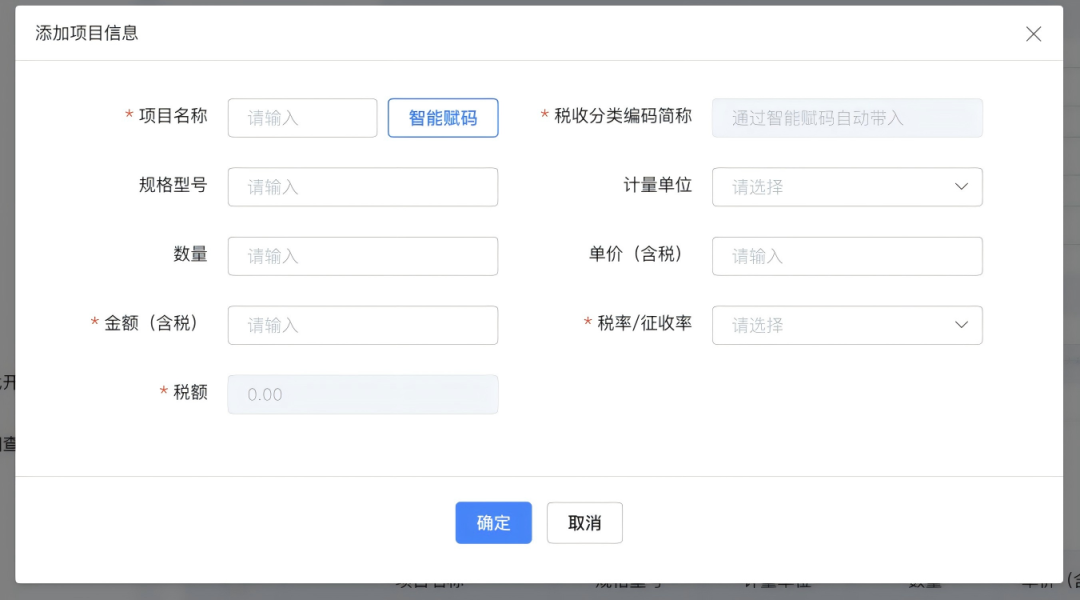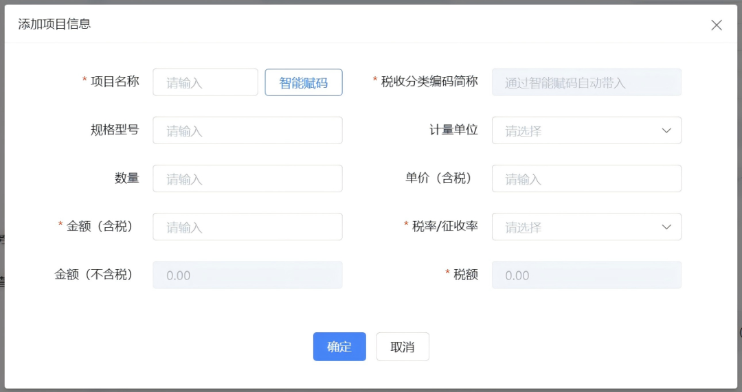 项目信息:点击“添加”按钮进入新增项目信息窗口。录入项目名称,点击智能赋码选择匹配的税收分类编码名称,然后依次录入规格型号、计量单位、数量、单价(含税)、金额(含税)、税率/征收率信息,然后点击“确定”完成添加。