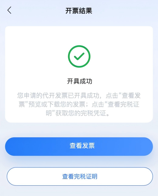 税款缴纳成功后,系统将自动开具发票。点击“查看发票”进入发票详情页面,可预览和下载电子发票。点击“查看完税证明”进入完税凭证下载页面,可将凭证下载保存至本地。