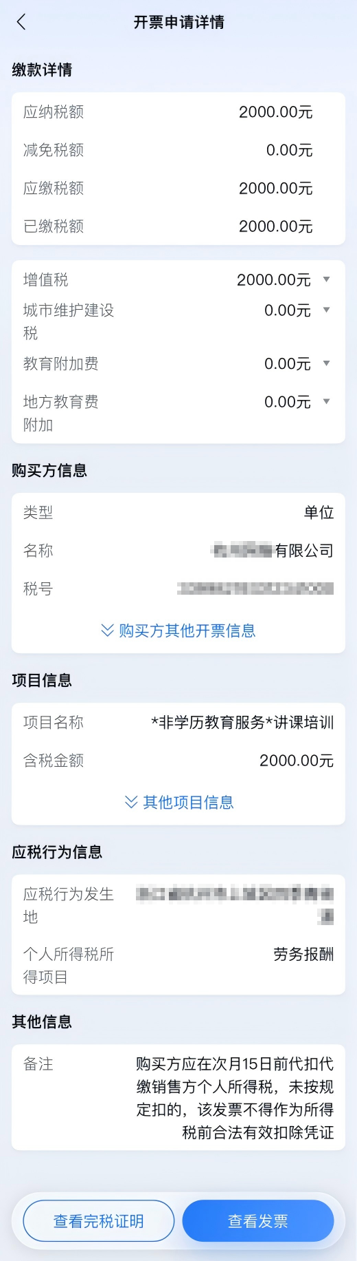 “发票信息”页面,代开申请人确认企业预填的销售方信息、购买方信息、项目信息、应税地信息、备注信息是否正确,不支持代开申请人修改,如有异常,可联系企业修改。
