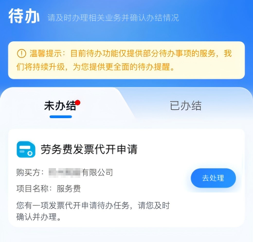 提交成功后,代开申请人的个人所得税APP同步收到相应的“劳务费发票代开申请”待办。