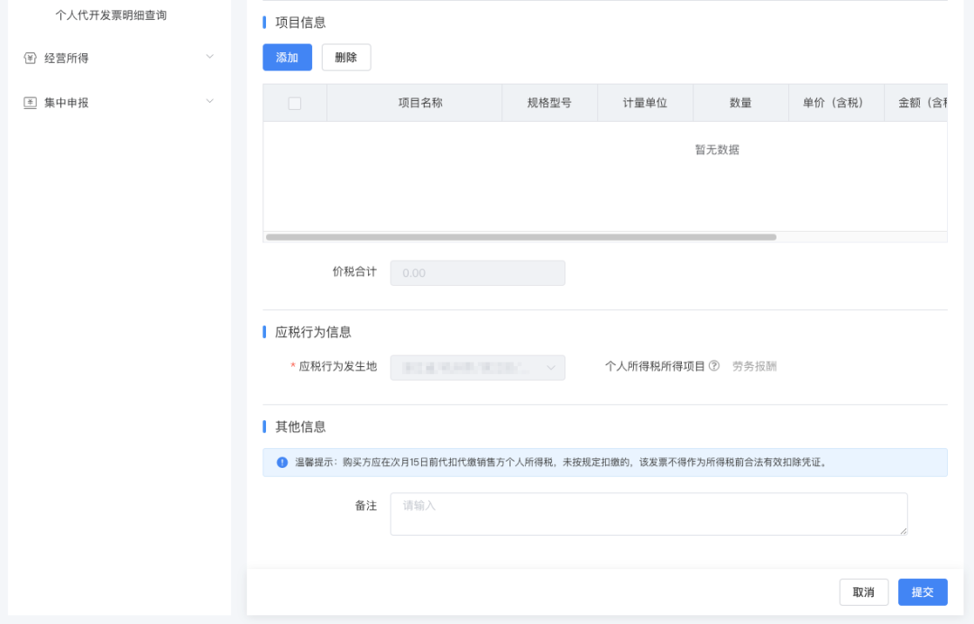 应税行为信息:应税行为发生地默认企业主管税务机关所在地,不支持修改;个人所得税项目默认为劳务报酬,不支持修改。