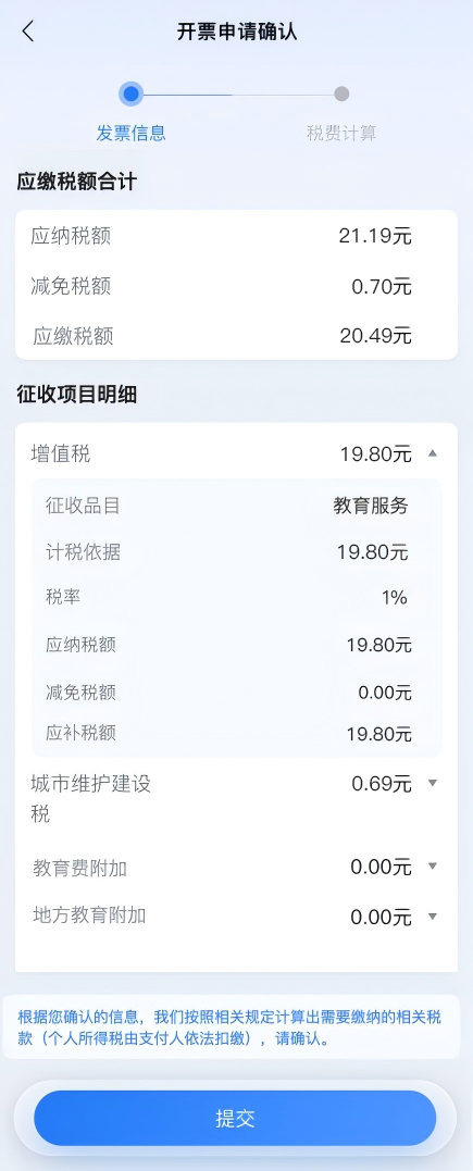 确认申请信息无误后,点击“下一步”进入税款计算页面,确认增值税、城市维护建设税、教育费附加、地方教育附加等各项征收项目应纳税额、减免税额、应缴税额等信息。