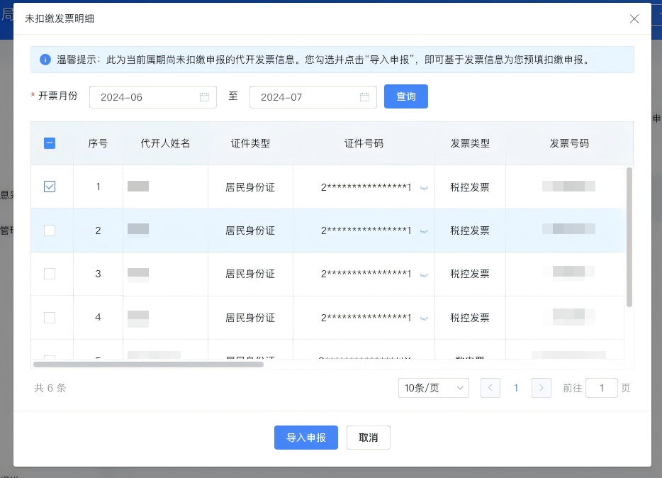 点击页面上方区域“查询”按钮左侧的“待扣缴发票明细”按钮,将出现弹窗,展示非汇总代开的所得项目为劳务报酬所得、申报状态为未申报或部分申报、发票状态为正常的发票数据。可单选或多选发票数据,点击“导入申报”按钮,系统根据发票信息自动生成相应的申报数据。