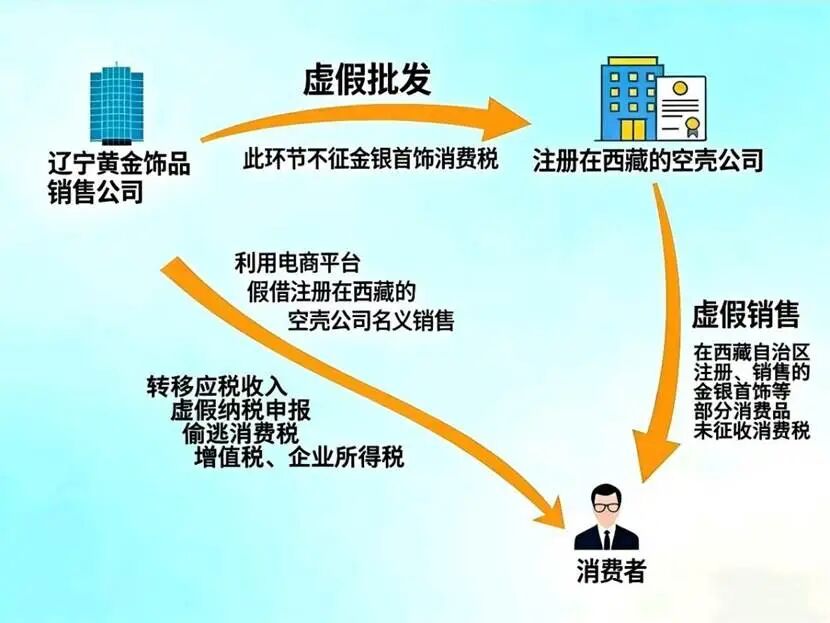 根据相关政策要求,西藏自治区对在本地注册、销售的金银首饰等消费品,暂未征收消费税。结合这个情况,税务人员初步判断潮尊公司“沈阳批发、西藏零售”的模式,存在转移应税收入、偷逃消费税的嫌疑。