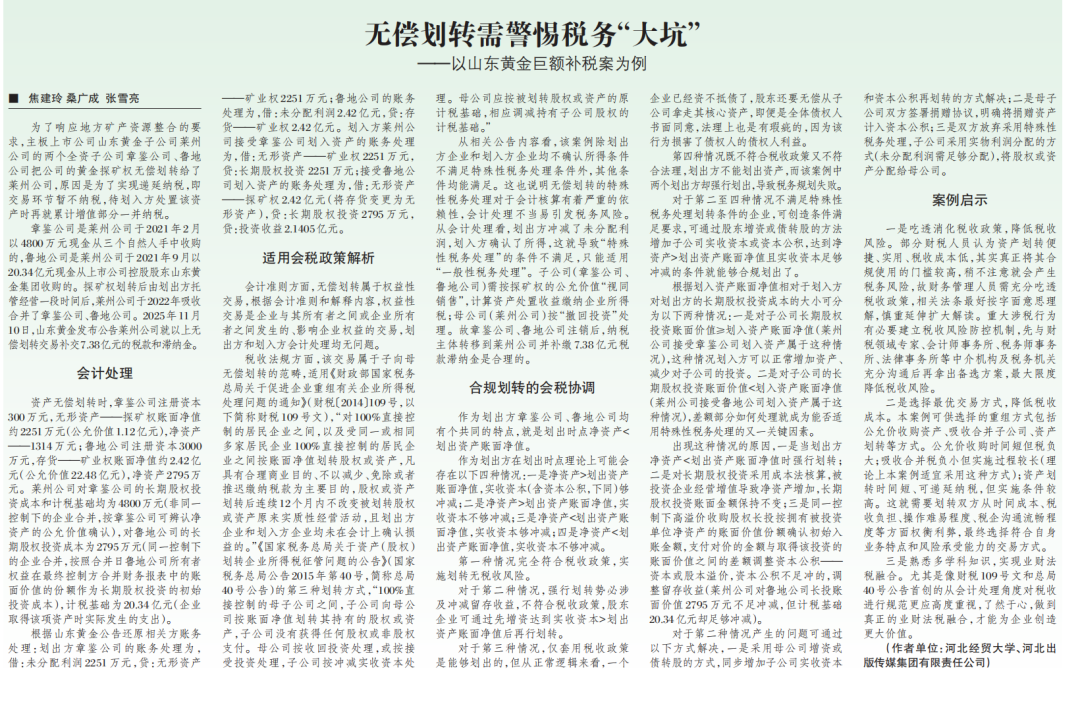 无偿划转需警惕税务“大坑”——以山东黄金为例