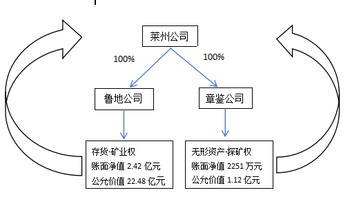 资产无偿划转时,章鉴公司注册资本300万元,无形资产-探矿权账面净值约2251万元(公允价值1.12亿元),净资产-1314万元;鲁地公司注册资本3000万元,存货-矿业权账面净值约2.42亿元(公允价值22.48亿元),净资产2795万元。莱州公司对章鉴公司的长期股权投资成本和计税基础均为4800万元(非同一控制下的企业合并,按章鉴公司可辨认净资产的公允价值确认),对鲁地公司的长期股权投资成本为2795万元(同一控制下的企业合并,按照合并日鲁地公司所有者权益在最终控制方合并财务报表中的账面价值的份额作为长期股权投资的初始投资成本),计税基础为20.34亿元(企业取得该项资产时实际发生的支出)。