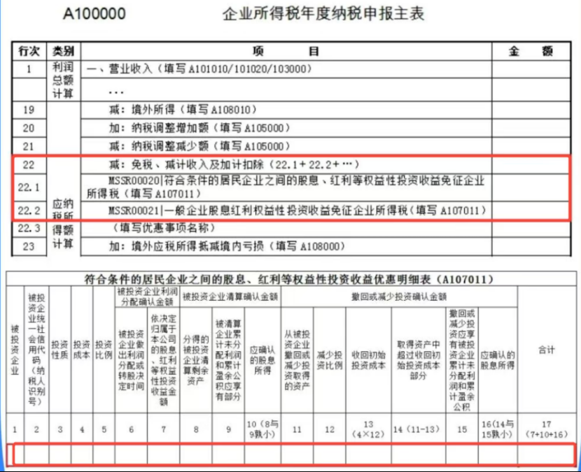 在“减:免税、减计收入及加计扣除”行次(第22行),填报享受股息红利免征企业所得税优惠的金额,具体通过选择“符合条件的居民企业之间的股息、红利等权益性投资收益免征企业所得税”优惠事项填报。