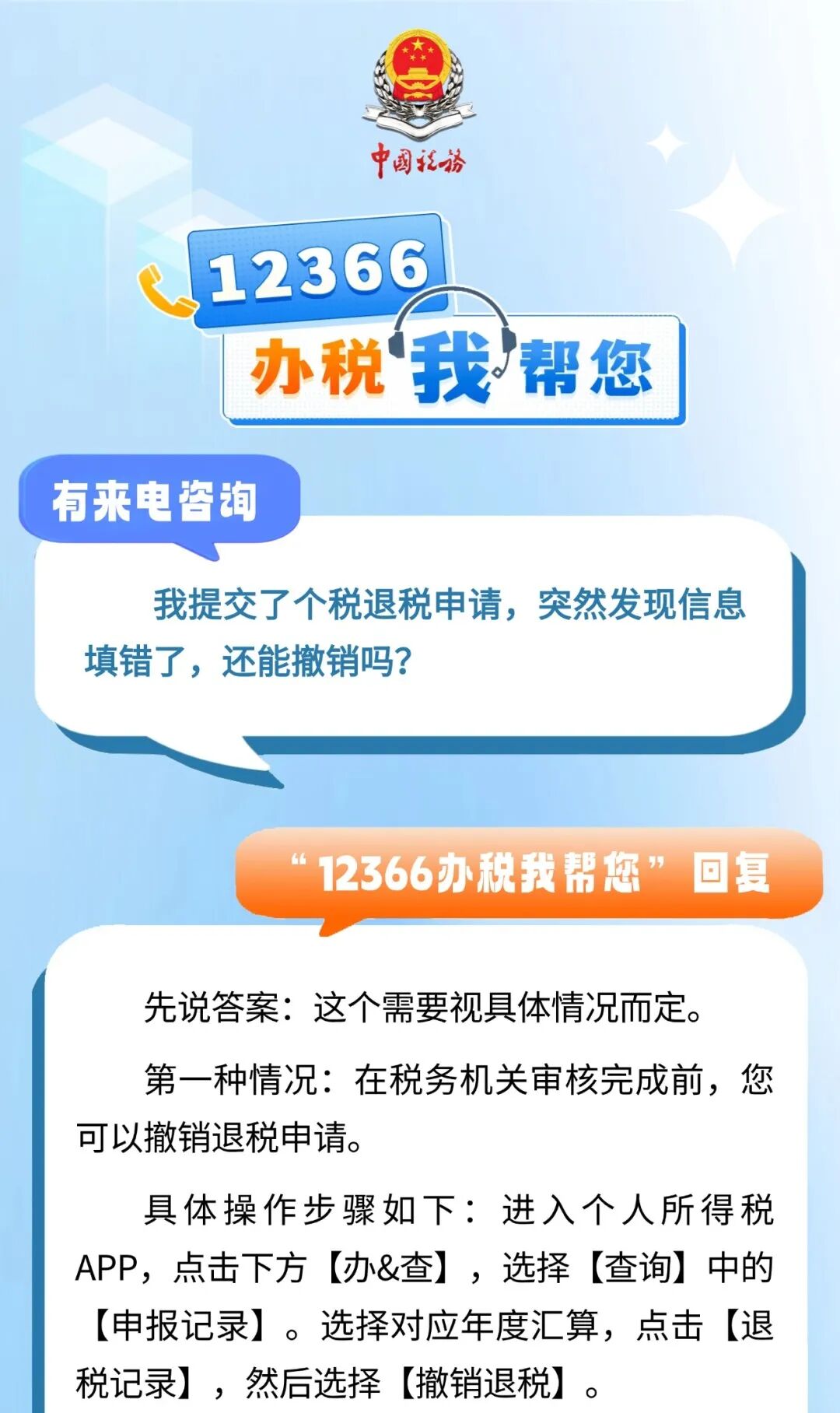 有来电咨询 :我提交了个税退税申请,突然发现信息填错了,还能撤销吗?一起来看看回复吧↓