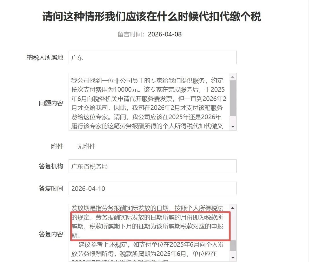 问题内容:我公司找到一位非公司员工的专家给我们提供服务,约定按次支付费用为10000元。该专家在完成服务后,于2025年6月向税务机关申请代开服务费发票,但一直到2026年2月才交给我司,因此,我司在2026年2月才支付该笔服务费给这位专家。请问,我公司应该在2025年还是2026年履行该专家的这笔劳务报酬所得的个人所得税代扣代缴义务?