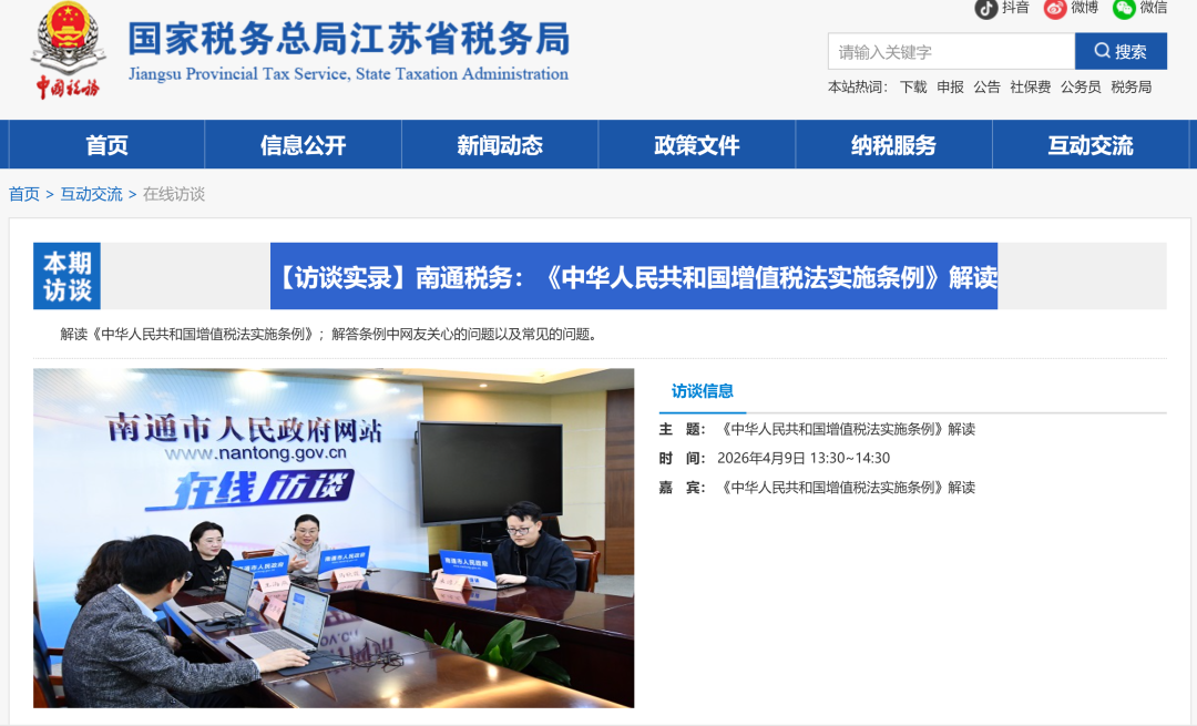 各位网友,大家好!感谢大家关注南通市人民政府网站“在线访谈”栏目。今天邀请到的嘉宾是国家税务总局南通市税务局党委委员、总会计师王海燕。自2026年1月1日起,《中华人民共和国增值税法》及其配套的《实施条例》正式施行,这是我国税收法治建设的一件大事,标志着我国第一大税种完成了从“暂行条例”到“法律”的跨越。今天围绕增值税法实施与大家进行在线交流,欢迎大家踊跃提问。王总,欢迎做客南通市人民政府网站。[ 2026-04-09 13:31:06 ]