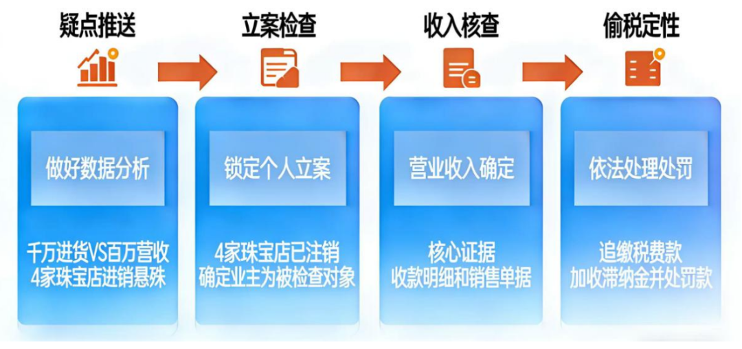 前期,国家税务总局阿克苏地区税务局通过税收大数据分析发现,富晨珠宝行2021-2024年申报收入仅为75万元,年均不足20万元,与该店同位于繁华市中心的其他珠宝行对比,存在巨大差异。鉴于此,税务部门立即对其开展风险核查。