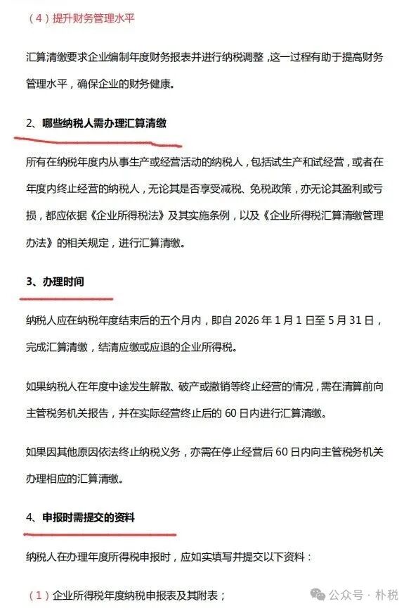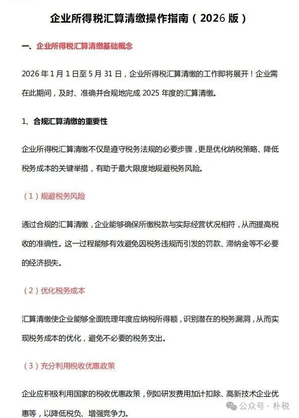 2026  5 月 31 日前,是企业所得税汇算清缴申报的开始时间和截止时间,企业需在此期间,及时、准确并合规地完成 2025 年度的汇算清缴,企业纳税人要注意截止时间,以免错过申报!今天朴税小编给大家整理详细的2026年企业所得税汇算清缴操作指南,以及企业所得税汇算清缴申报A表35张表带批注底稿(最新),不清楚申报流程和报表如何填写的朋友,可以参考!
