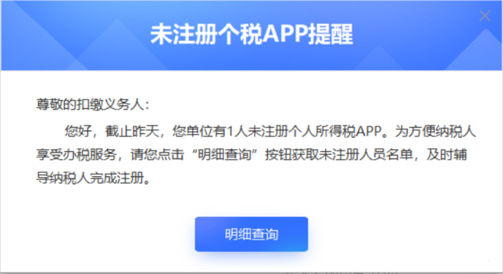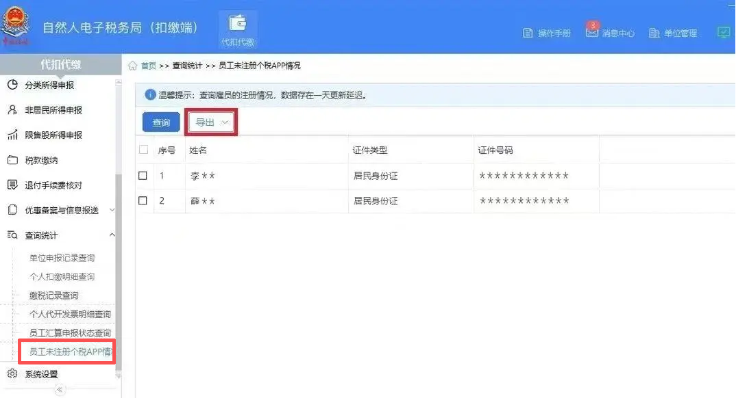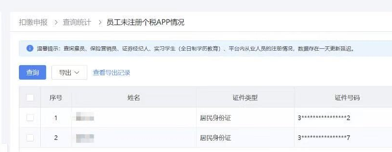 会清晰提示未注册个税APP人数,点击“明细查询”可查看具体人员信息,包括姓名、身份证号、联系电话等信息。